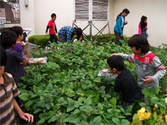 順調に成長していく大豆を見守ってい く中で、子どもたちは大豆への興味を高めて行き、観察記録には丁寧に色を塗って大豆の葉や花の様子が描 かれています。ただ、問題は夏休みの間の管理です。 プランター栽培の場合は特に、水を絶やさないように といわれていたので、そのためにどうしたらいいか、 これも子どもたちに考えさせました。水やり当番を決めようということになりましたが、ひとり何回、と決めるまでもなく、自発的に「私はこの日行ける」「僕はこっち」と自分から計画を立てて、1日4人だったり6人だったり、みんなが計画通り学校に来て、水やり・観察をしている姿が見られました。